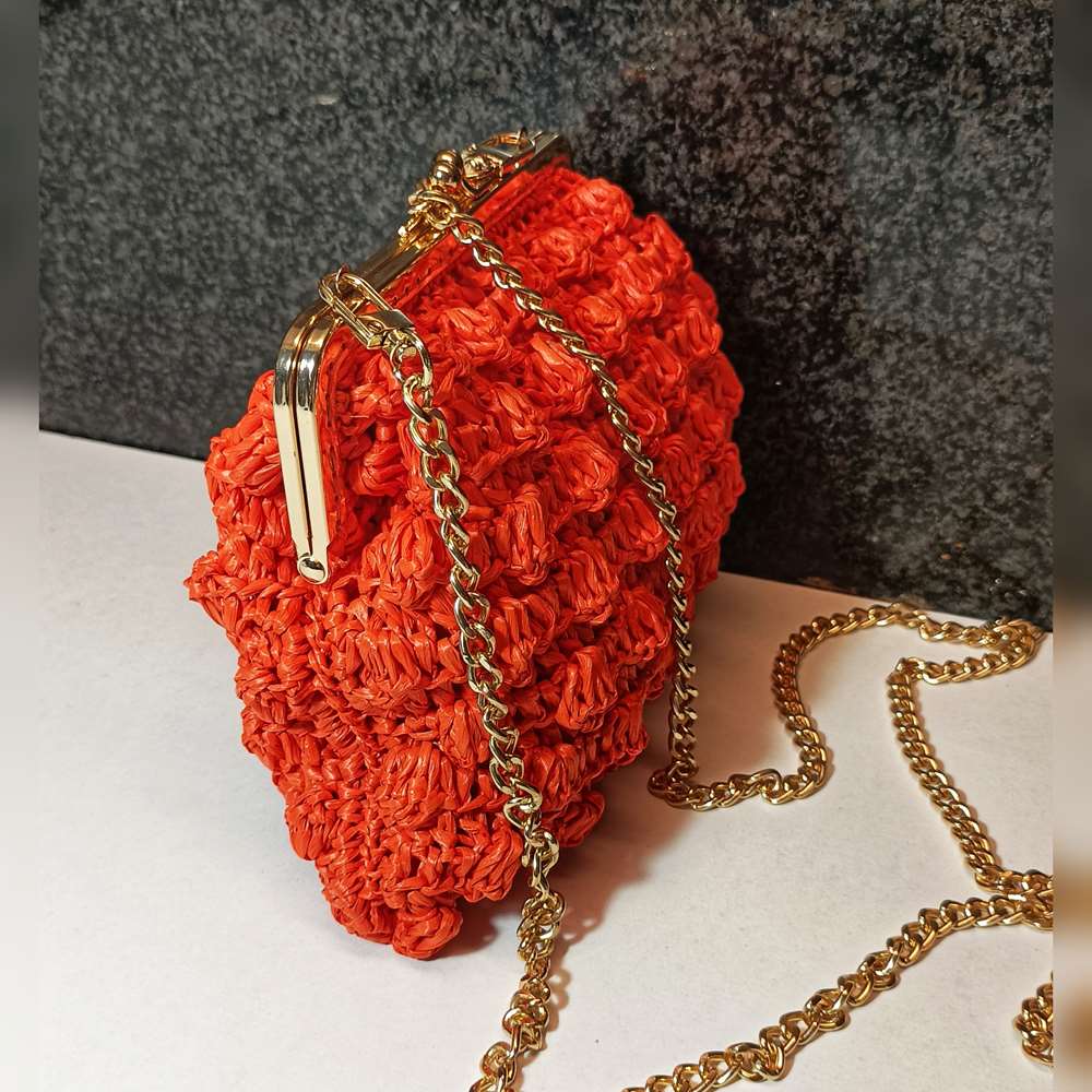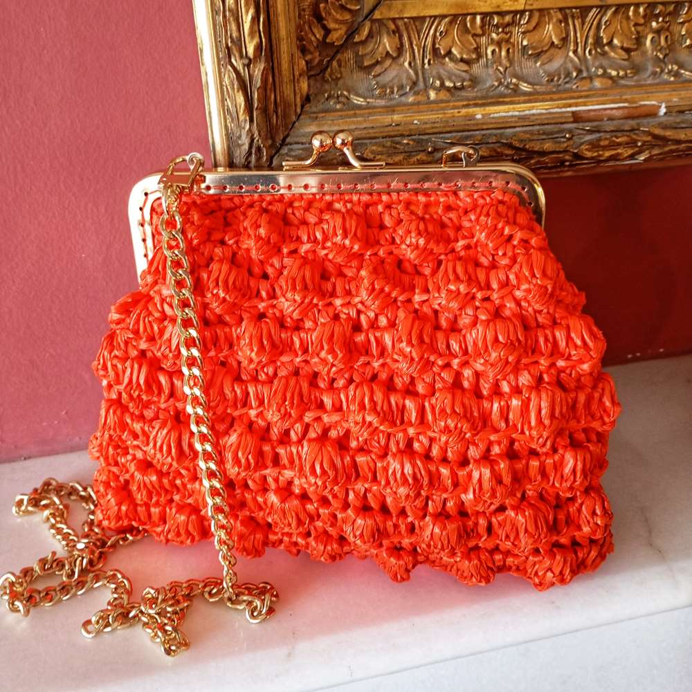 Presenting our Dolcianni Lily Orange Raffia Clutch, a small crossbody striking accessory that embodies the essence of vintage charm.The vibrand hue of orange , adds a pop of warmth and personality, making it an ideal statement piece for any occasion. It is crafted with raffia yarn of excellent quality and is lined with satin orange fabric. The golden crossbody chain makes the Lily Orange Raffia Clutch a convenient accessory. It is totally handmade which makes it unique. This small marvel of craftmanship, exudes an old-world charm . It comes in a dust bag so that you can keep it clean and protected.