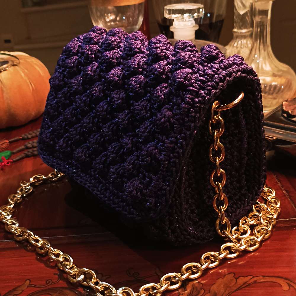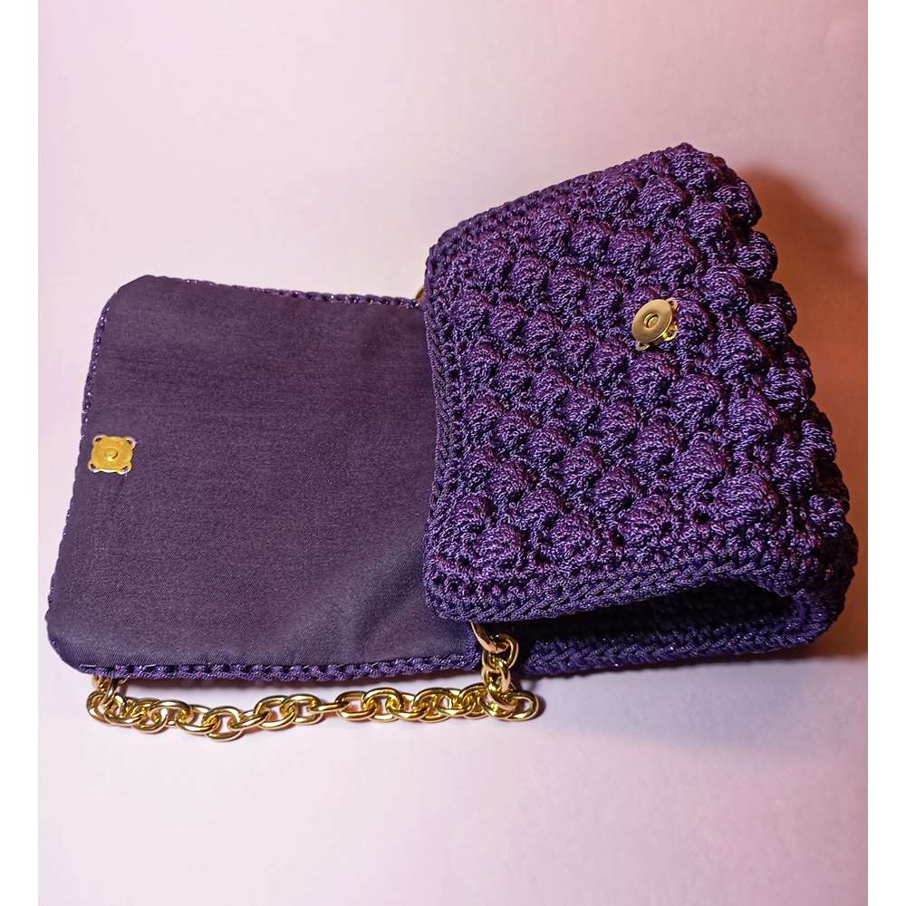 The Purple Crossbody Bubble Bag is the epitome of elegance and artistry. Crafted with meticulous attention to detail, this exquisite bag is a testament to the artisan’s passion and dedication. The deep purple colour of the bag exudes a sense of mystique and sophistication , while the glittering purple yarn that adorns it, adds a touch of glamour .The crossbody golden chain makes this bag practical and convenient. Lined with a high quality fabric and being 100% handmade, makes the Purple Crossbody Bubble Bag unique. It comes in a dust bag so that you can keep it clean and protected.