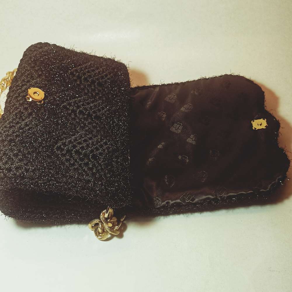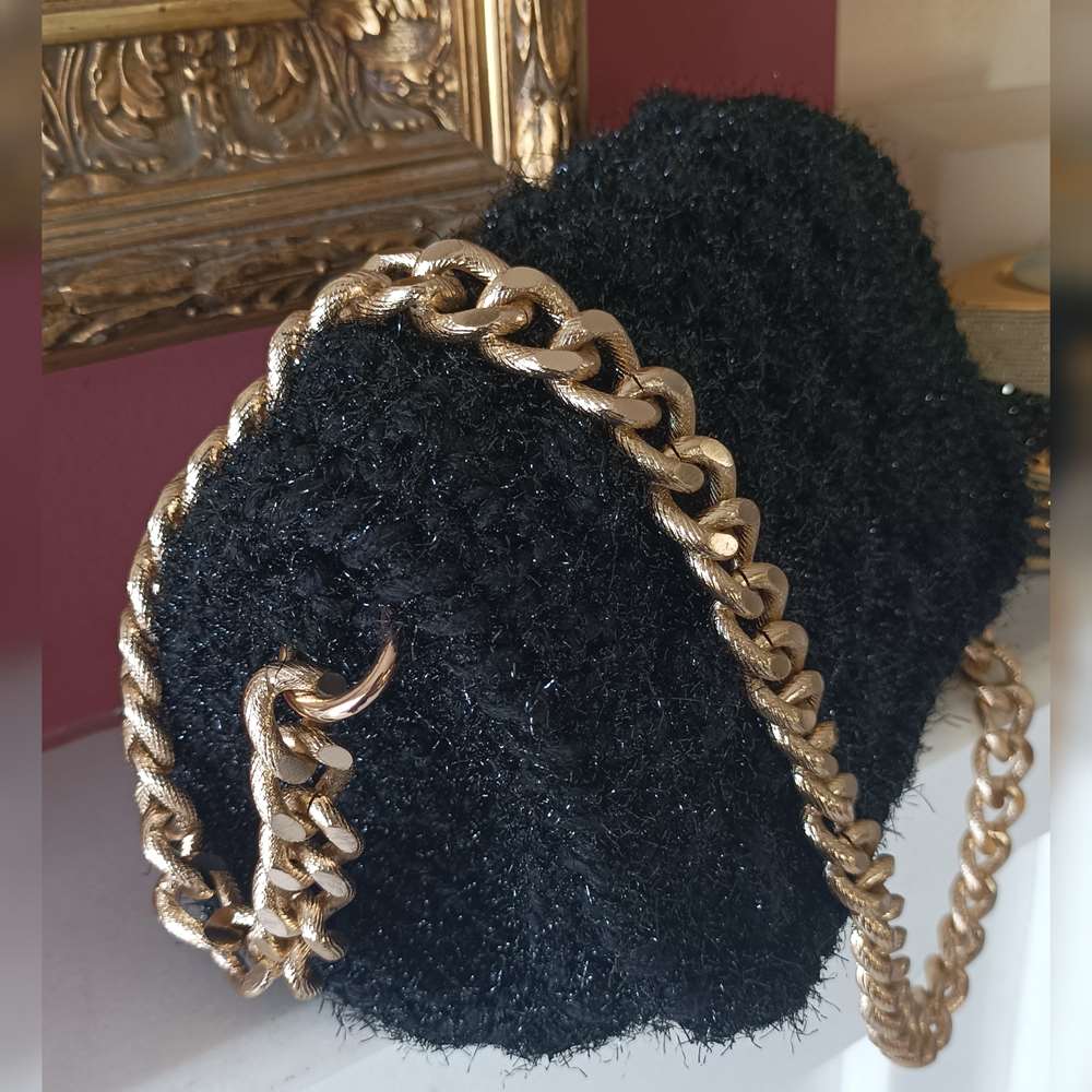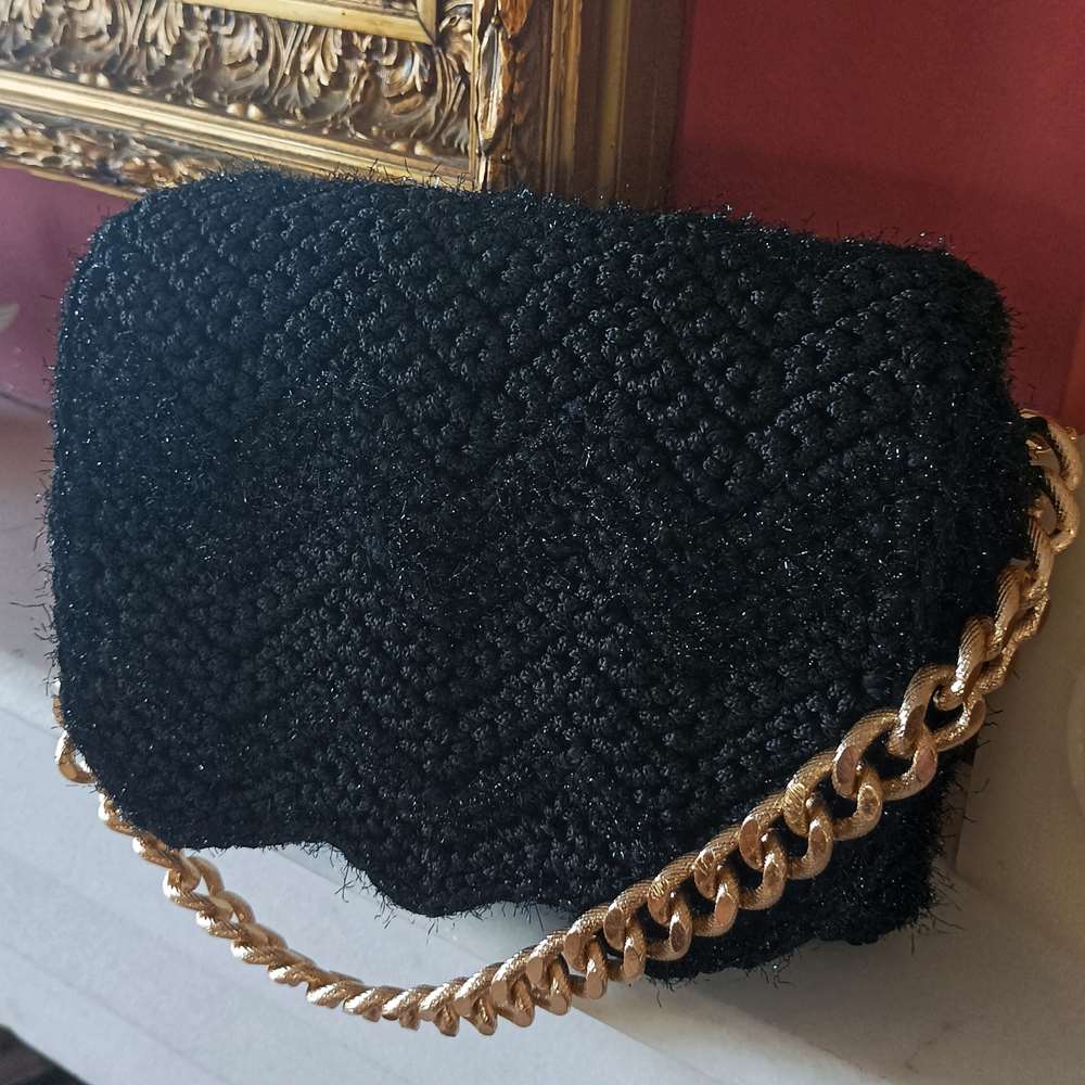 The Dolcianni Sparkling Black Crochet Bag is a stunning crochet handmade bag, designed and crafted with meticulous care. Its timeless design, complements any ensemble. The interplay of a luxurious sparkling yarn and a classic black polypropylene yarn , create a texture that catches the light with every movement. The interior of this bag is lined with a black satin high quality fabric.Adding to its allure, a radiant golden forged shoulder-length chain completes the design , providing both elegance and functionality.