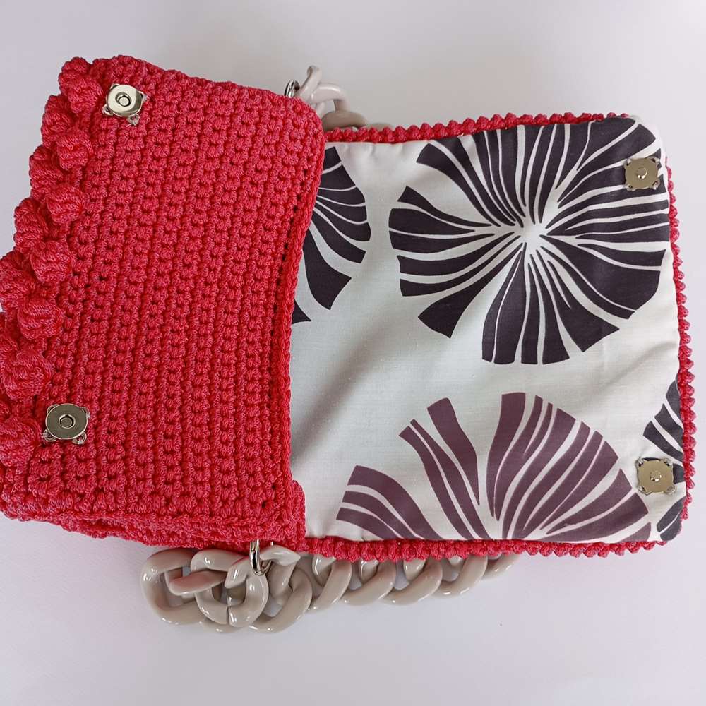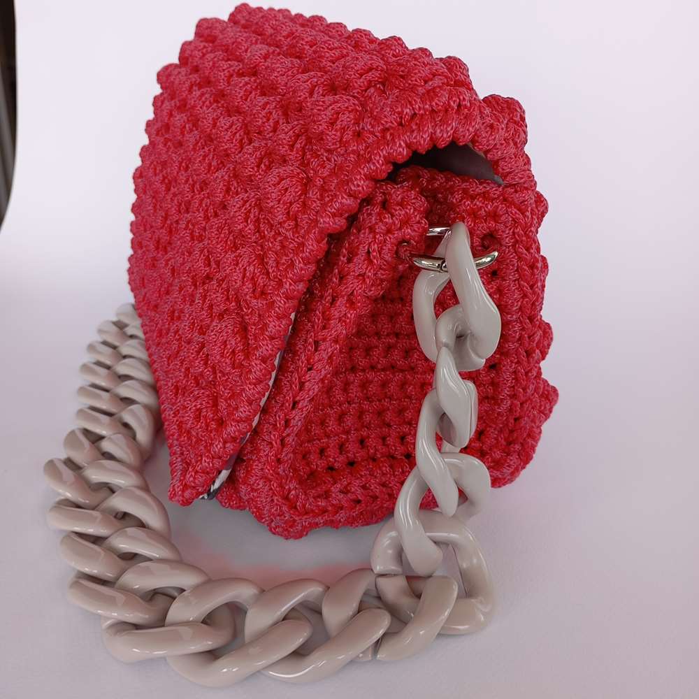 The Watermelon Fuchsia Bubble Bag is a handmade crochet bag, featuring a shoulder length light grey bone chain for a touch of elegance. The multicolour lining adds a playful and fun element. A statement piece, crafted with love and attention to detail.